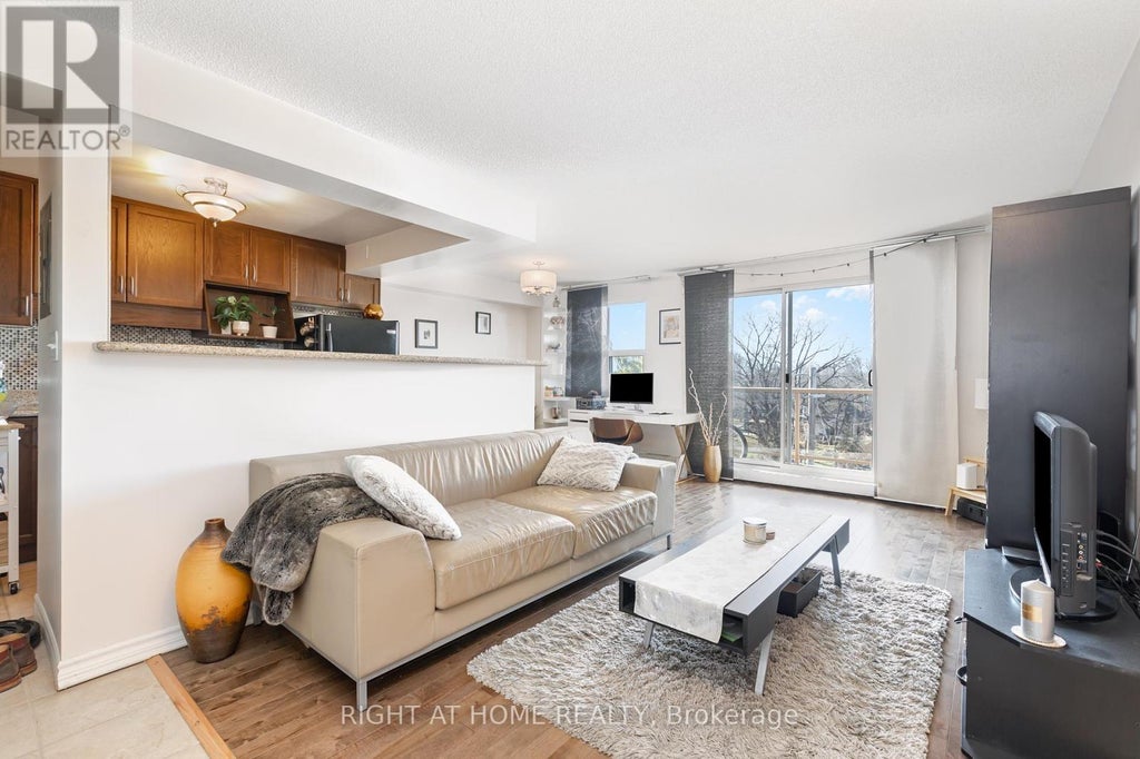 Welcome first time buyers/investors/downsizers. This beautiful, bright one bedroom apartment features an open concept kitchen/living/dining room, large balcony with an amazing view. Granite countertops in kitchen, loads of cupboards space, breakfast bar. Hardwood floor in living, dining room and bedroom. In-suit laundry for your convenience. Public transportation, parks, trails, easy access to HWY 403. Building features 2 elevators, party room, exercise room. Newly renovated garage. (id:6289)