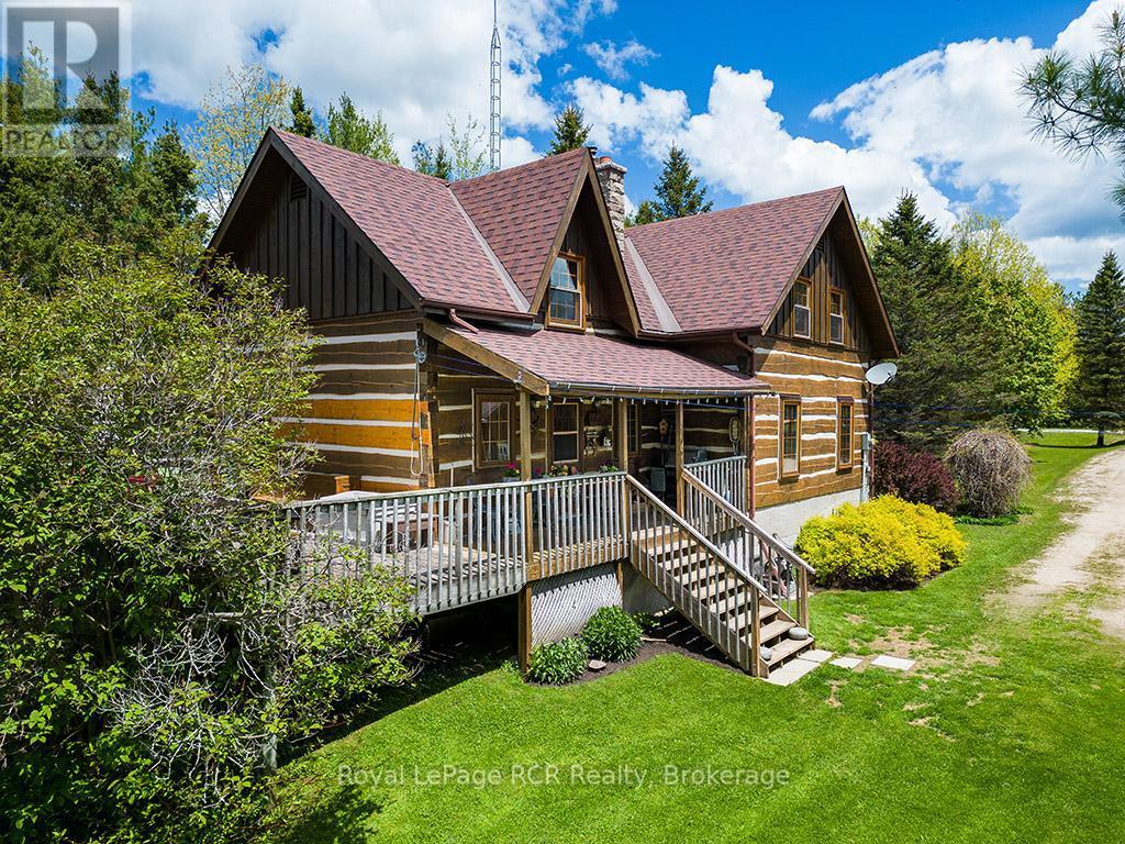 Full-log retreat on 5 private acres with a 3-bay shop. A covered front porch leads into the country kitchen with breakfast nook, a wood-burning cookstove, and a walkout to the side deck for morning coffee. Main floor laundry and a handy 2-pc bath. The heart of the home is a spacious dining/living room where wide-plank floors and a stone fireplace set the tone for relaxed family time and easy entertaining.Upstairs are four bedrooms, including a generous principal with cheater access to a 5-pc bath featuring a classic roll-top tub. The fourth bedroom is an ideal nursery, office, or dressing room. The finished lower level extends your living space with a cozy rec room warmed by a woodstove, plus a hobby room and a wood/utility storage area.Outside, enjoy room to roam: mowed trails weave through the property to a natural, seasonal stream at the west edge. The detached, L-shaped approx. 1,359 sq ft garage/workshop offers excellent space for vehicles, tools, and toysperfect for the hobbyist. Just a short drive to town amenities, this is comfortable country living with character, privacy, and plenty of space to make it your own. (id:6289)