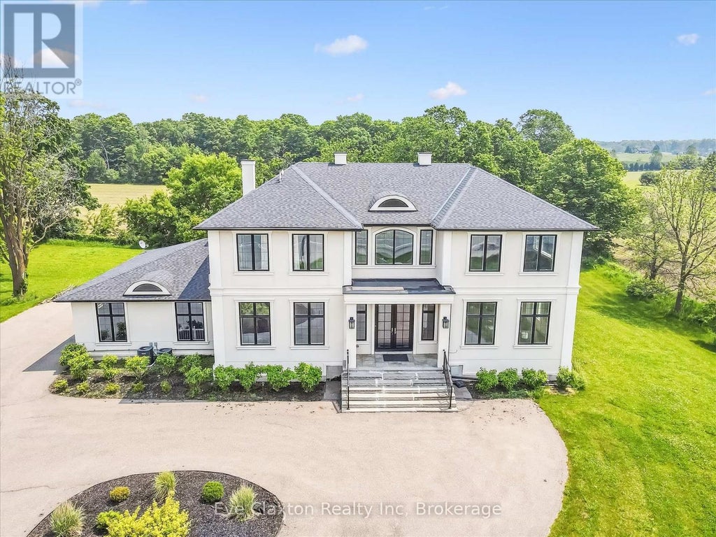 Nestled on 2 acres of land, this grand and spacious home offers exceptional living space and unmatched luxury. Boasting 8,400 sq ft of finished living area, this property is located just a short drive from all amenities and Highway 401.The home greets you with impressive curb appeal, featuring a circular driveway and a 3-car garage. The grand double curved staircase sets the tone for the rest of the home. Featuring large principal rooms and expansive ceiling heights that provide an inviting and airy atmosphere flooded with natural light . The double-story great room opens to below, providing a dramatic focal point, and is perfect for gathering or simply relaxing. The gourmet kitchen is a chefs dream, showcasing custom cabinetry, large island, quartz countertops, B/I appliances, and a cozy breakfast area with B/I bench seating. Custom built-in cabinets and bookshelves in the Den and Great Room, are complemented by cozy linear gas fireplaces that add warmth and sophistication to the space. The entire home features a carpet-free interior with clean, modern finishes throughout.The main floor is dedicated to convenience and comfort, with a spacious master suite complete with an ensuite bath and walk-in closet. In addition the home offers a formal living/dining area perfect for entertaining and a home office/den. On the upper level, you'll find a second primary bedroom with its own private ensuite and 2 additional bedrooms and ensuites . The oversized upper landing provides versatile space that can be used as a sitting area, kids lounge, or easily converted to a bedroom. A second-floor laundry room adds to the home's practicality.The fully finished lower level extends the homes living space even further, with a walk-out to the rear patio and a separate entrance. It features an oversized rec room and games area with a wet bar, as well as a dedicated theatre room.Offering unparalleled space and functionality, designed for luxury living and effortless entertaining. (id:6289)