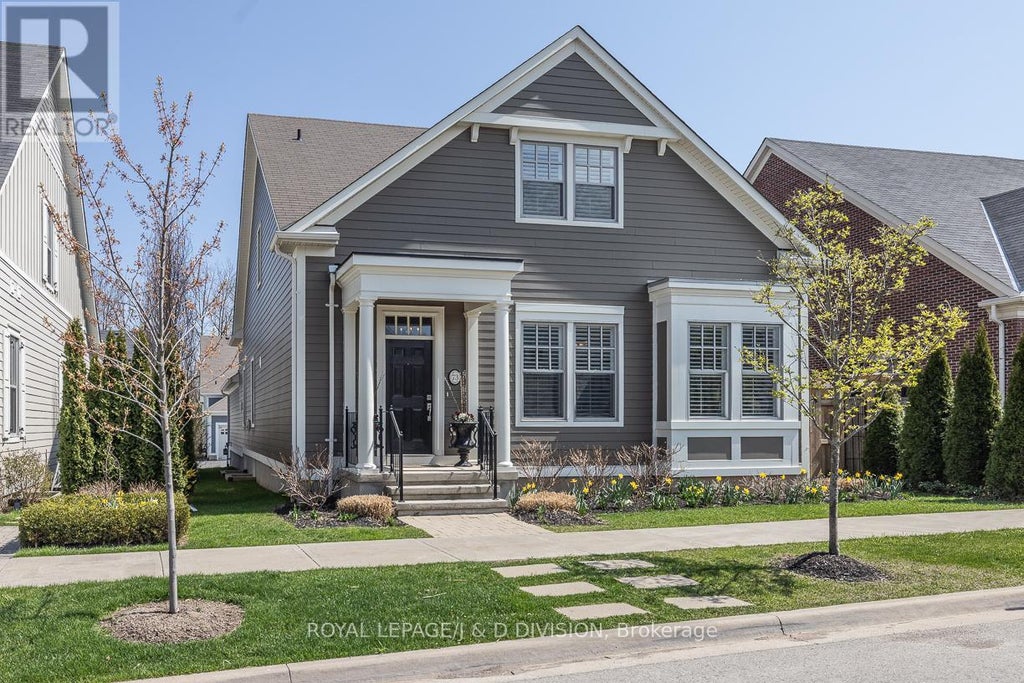 Welcome to the Village, a very charming community of period style houses. This home was built in 2017 with numerous upgrades by the current owners, and offers all the modern conveniences as well as terrific character. The welcoming foyer with a dramatic open spiral staircase leads into a quiet den, and an open concept kitchen/dining/living room with dramatic vaulted ceilings, flooded with natural light. The elegant finishes include hardwood floors, gas fireplace, crown moulding, French doors, and custom designed built-ins and cabinetry. Towards the rear of the home, French doors lead down into the back entrance with laundry, as well as walkouts to the one car garage with additional parking space, and the beautifully landscaped back/side gardens and patio. The primary bedroom is located on the main floor and has a spacious walk-in closet as well as a five piece spa-inspired ensuite washroom. Upstairs, there are two additional bedrooms and an open family room that overlooks the living and dining room. The finished lower level is extremely spacious and bright with a kitchenette and dining area, a recreation room and home office, plus ample storage and a second laundry. This lovely property is located just minutes away from the town of Niagara-on-the-Lake, with shops, restaurants, parks, and Lake Ontario. The house is walkable to the nearby plaza with Shoppers Drug Mart, LifeLabs, medical center, a future Foodland grocery store, banks, and more. Surrounded by wineries, orchards, and golf courses, experience all that the Niagara Region offers in this quiet and idyllic neighbourhood. (id:6289)
