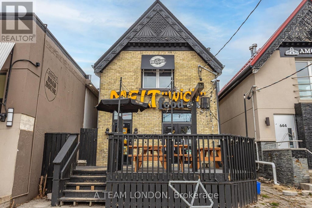 For sale: Approximately 1,900 sq ft commercial building on Richmond Row, next door to Chuck's Roadhouse on Richmond Row, the central north-south urban boulevard that runs through London's downtown. A go-to destination for the latest trends, original retail, dining and nightlife options, Richmond Row provides plenty of entertainment options for everyone during the day, evening and night. Approx. 950 sq feet on main floor plus room for 18 seats on the outdoor patio. Main floor currently leased to Meltwich restaurant until August 2033. Separately metered 950 sq ft, 1 bedroom upper residential unit with month to month tenant paying $1,400.00+. Gas powered heater on main floor plus natural gas fireplace on second floor. BDC(1) Zoning allows offices, medical/dental, personal service establishments, retail, restaurant, studios and more. (id:6289)