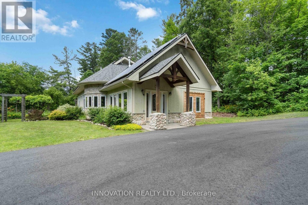 Discover your Urban Oasis! This custom-designed, ecologically sustainable post-and-beam home sits on a serene peninsula in Pembroke, with 2.8 acres of lush forest. Enjoy privacy and natural beauty while having all amenities at your doorstep. The open-concept main level boasts 23-ft ceilings and features a newly renovated kitchen with custom pine cupboards, quartz countertops, and modern appliances. Relax in the curved sitting area with a gas fireplace or by the wood stove in the living room. The main level includes an office, two full bathrooms, and three bedrooms, including the primary suite with a walk-in closet and sliding doors leading to a patio with river views. The upper level offers bonus rooms, a large storage area, and a fourth bedroom overlooking the garden. Updates include paved driveway with a gate 2023, new washer & dryer 2022, infrared sauna 2023, new owned Hot Water Heater 2025. Additional features include two outdoor sheds, a hot tub, and solar panels providing passive income. Book your showing today! (id:6289)
