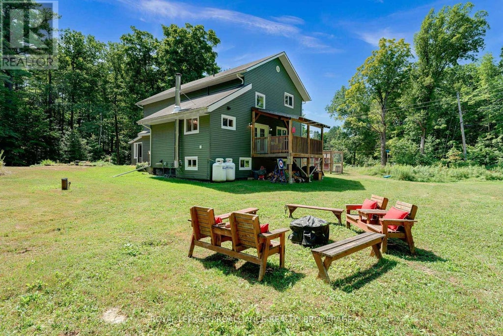Just past the charming village of Verona, this 4-bedroom, 3-bath, lovingly renovated beauty blends timeless character with all the modern comforts of home. Entering through the side entrance, you're welcomed into a spacious combined foyer and laundry area, freshly updated with built-in wooden bench and custom open shelving. Continue on into a beautiful open concept kitchen with centre island, family room and dining room space with vaulted ceilings, with plenty of room for entertaining. The exposed original log posts and beams give the house a unique sense of warmth, nostalgia and character. Off of the family room you'll discover a fully renovated 3-piece main bathroom, complete with walk-in shower and ceramic tile floors. Patio doors lead you out to a sun-soaked back deck overlooking a large private backyard that's a perfect place to sip your morning coffee or have late-night chats under the stars. Past the family and dining areas, you will find a sunken living room with a new propane wood-stove and the first of four bedrooms. Walking up the gorgeous new hardwood staircase to the second floor, are three more well-appointed bedrooms, and the second floor 4-piece bathroom featuring a soaker tub and convenient linen closet. Heading back downstairs toward the basement is another side entrance on the west side of the home, opening up the possibility for a future in-law suite. The unfinished basement with additional 4-piece bathroom and wood-stove is awaiting your finishing touch. The real gift that this property has to offer is its location; the peaceful, tree-lined country road, close to amenities such as The K&P Trail, Rivendell Golf Club, McMullen Beach on Verona Lake and Public Boat Launch. This property comes with its very own chicken coop, a cozy fire pit for smores and stargazing, and lots of space to roam. All you have to do is move-in and start living the good life! A full list of updates is complete and available. (id:6289)