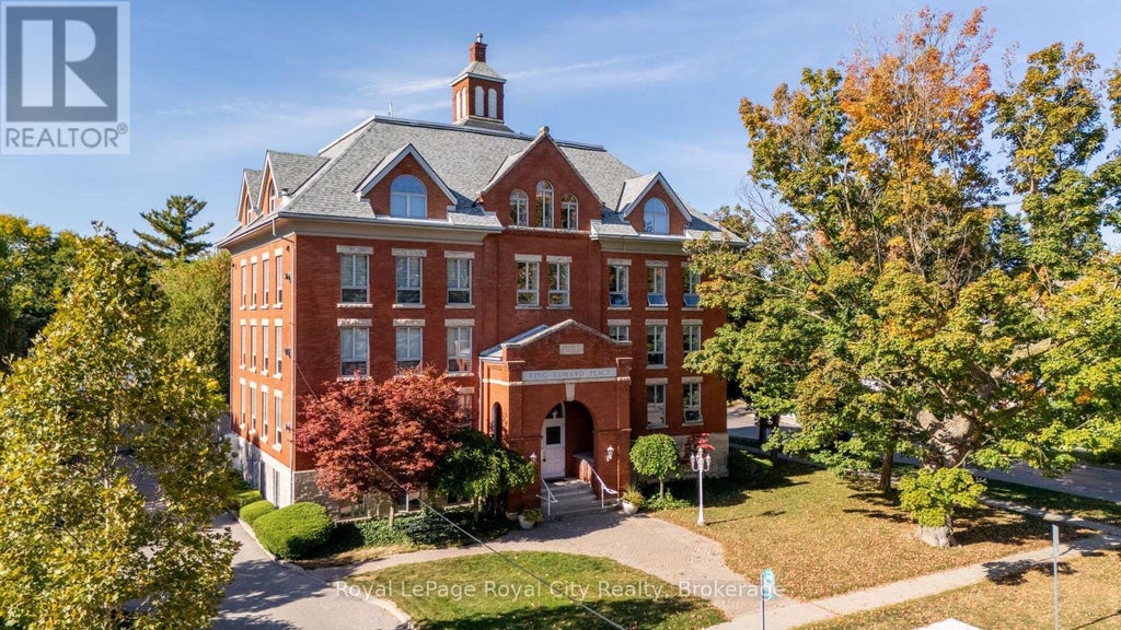Centrally located within one of Guelph's most sought-after downtown neighbourhoods, unit 101 is a spacious one-bedroom plus den condo awaiting you. King Edward Place offers a simple and secure lifestyle within a charming former schoolhouse. Originally built at the turn of the last century and thoughtfully reimagined in the 1990s by the Shortreed family, this exclusive 9-unit condominium blends history with modern comfort. Natural light fills the space through seven oversized casement windows framed by 2-foot-thick walls, creating a sense of tranquility and timeless character. The kitchen features an exposed brick accent wall, complete with a built-in oven, adding to the units unique charm. The large primary bedroom includes a private ensuite with a jet tub, while the spacious living room offers a cozy gas fireplace as its focal point. A versatile den and additional bathroom complete the thoughtful layout, making this condo both practical and inviting. This building has full elevator access. 2024 Gas and Hydro bills approx. $2400.00. (id:6289)