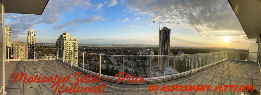 Welcome to Gold House built by Rize Alliance. This luxurious 1464sqft 3beds/3 full baths Penthouse comes with 1189sqft massive warp around patio plus nearly 13'ceiling. Enjoy panoramic water and mountain views from every corner of the home. The features include high end Bosch kitchen appliance package, custom Italian Armony Cuvine soft-closing cabinets, spa inspired bathrooms with quartz and marble counter tops. the unit comes with VRF heating and/cooling system. Over 30,000 sqft of indoor/outdoor luxurious amenities including an expansive party room with private dining and kitchen, 24 hours concierge, gym and much more. Steps to public transit, Metrotown mall, Crystal mall, Bonsor community centre, public library. It comes with 3 side by side parkings and 1 huge locker.