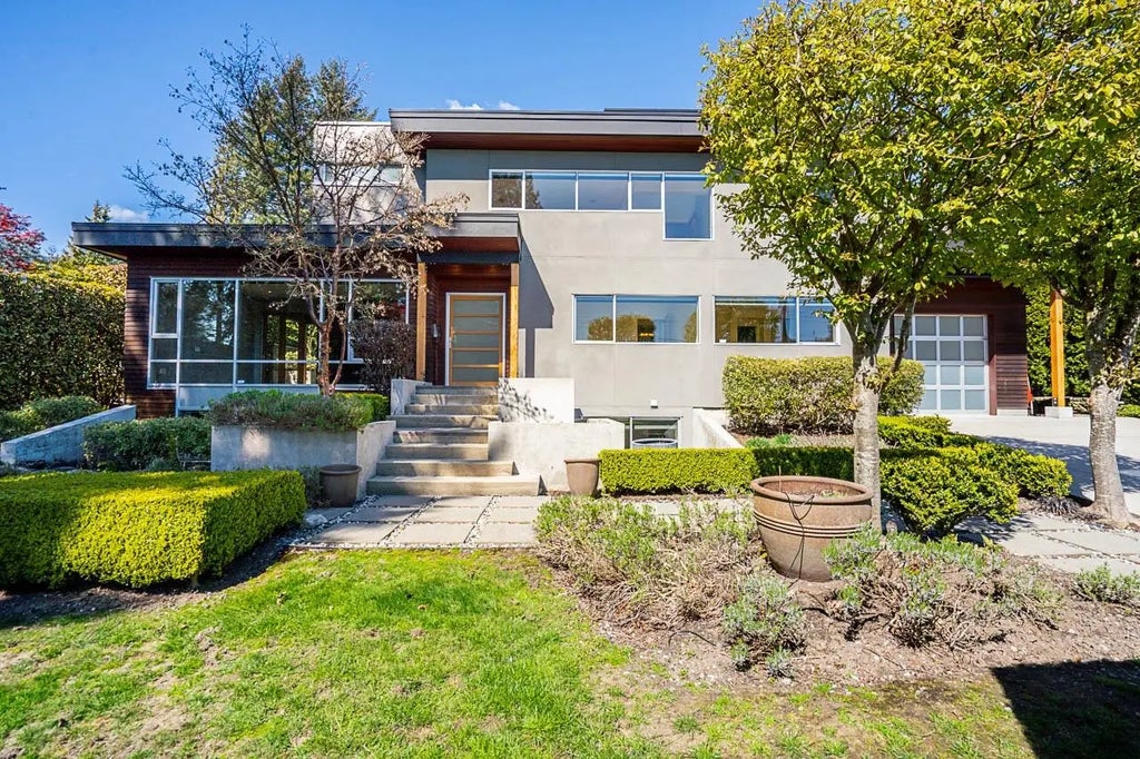 This contemporary Euro-style family home is nestled on a serene street in upper Ambleside & was completely rebuilt in 2008 using portion of foundation/framing of original 1955 home. Its large south-facing windows offer stunning water views of Stanley Park and downtown. Flooded with natural light, the home spans three levels featuring 5 bedrooms and 4 bathrooms, including a luxurious master suite with spa-like amenities. The lower level boasts a spacious rec room, media room, additional bedroom, and ample storage. An open kitchen and indoor-outdoor entertainment area with covered dining, firepit, putting green, two upper patios, and a built-in waterfall pond create the perfect setting for gatherings. Conveniently located near country clubs, shopping, and within walking distance to schools.