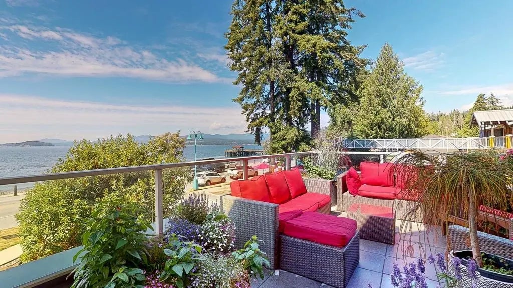 More than just a lovely place to live, this home is an experience. With a front row seat to a 180° ocean view, you are a part of all that the Salish Sea offers. Whales, dolphins, sea lions regularly visit. Watch the placid tug boats while the sun sets, and witness the winter storms as they blow in. With enormous windows strategically angled to give every room a view, this home has tons of light and still feels cozy and welcoming. This marquis unit has a surprising amount of privacy with neighboring coffee shop and services adding both charm and lifestyle. Enjoy your own expansive covered and uncovered deck with full seasonal gardens. Welcome to your new home.