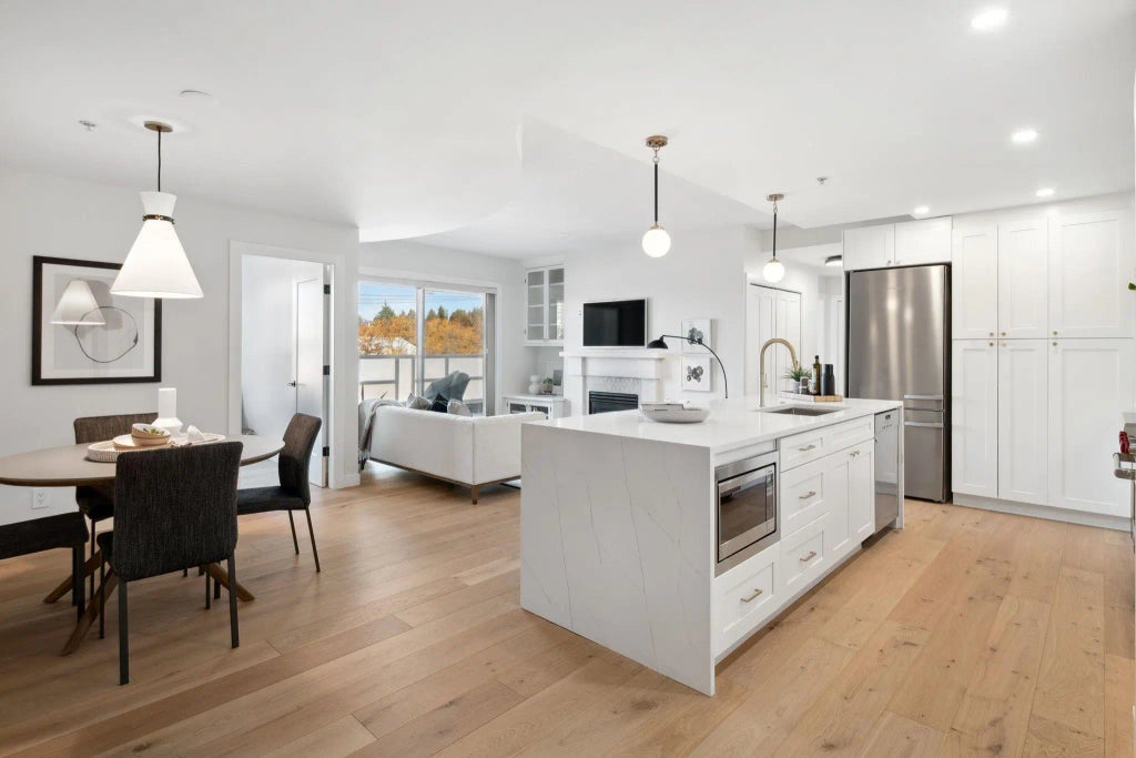 Welcome to The award winning Laureates in the heart of Kerrisdale. This professionally redesigned 3-bed,2-bath offers 1353 sqft of spacious & modern living space in Vancouver’s most sought after neighbourhoods. Look out from the entertainers kitch through the open-concept living area into large north facing windows flooding the space w/ natural light. Beautiful new hardwood flrs flow seamlessly through the grand foyer,living & gourmet kitch, creating a warm & inviting atmosphere. Features incl an oversized kitch island,new cabinets,counters, tiles,paint,light fixtures,built-ins,Hunter Douglas blinds,Miele & Wolf Appliances. 2 large private patios off the living areas, large walk in closet & locker. Walk to School,Transportation,Shops & Arbutus Greenway in seconds.
