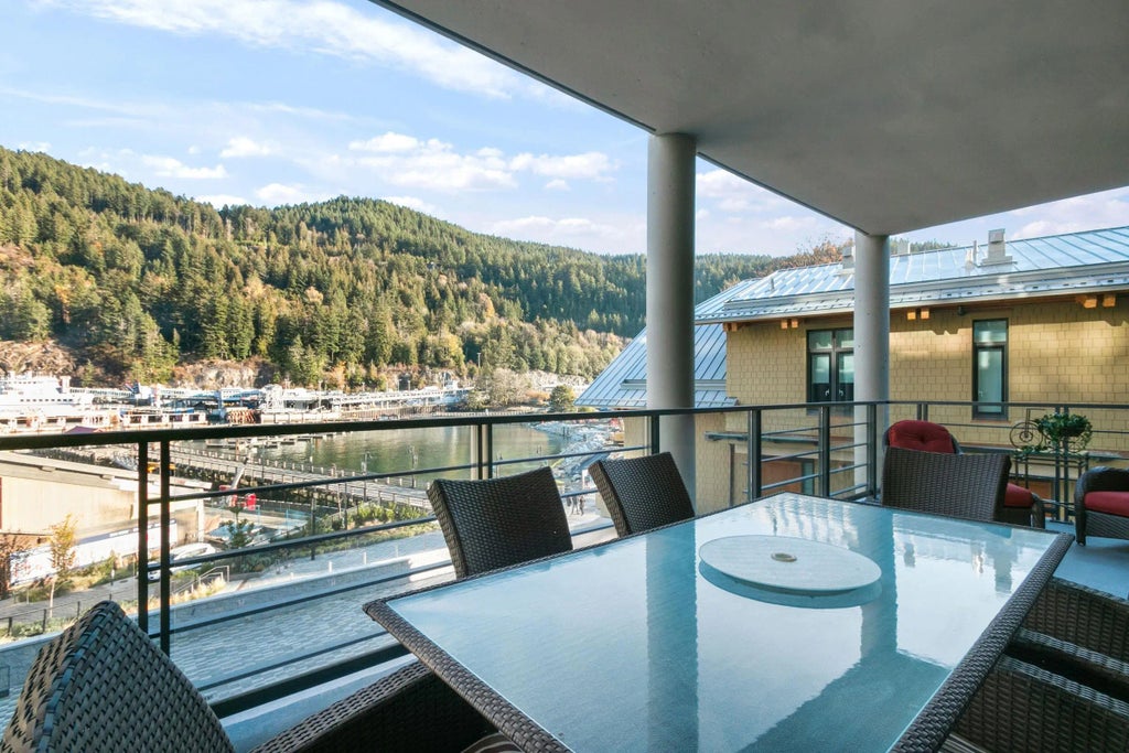 DIRECT WATERFRONT facing unit in The Sanctuary at Horseshoe Bay. This home embodies all that Master architect Paul Merrick created - a living celebration where habitat and nature join in harmony. The BEST LAYOUT in the complex, its breadth includes 265sf huge balcony which allows for powerful, dynamic waterfront VIEWS over the marina & serene MOUNTAIN vistas. Inside, living is spacious, comfortable and all the finishes are exquisite; Chef’s kitchen with Miele appliances, huge island to entertain, stone clad natural gas fireplace, laundry room with organizers. 2 large bedrooms & 2 full bathrooms are well separated from the main living areas. Luxury lifestyle is complete with separate locker & parking stall with electric charger, world class amenities including boathouse & 24 hour concierge