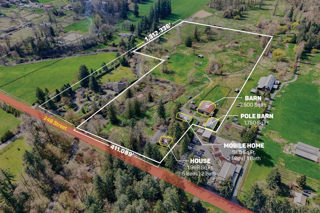 17.49 ACRES, 2 HOMES AND 2 BUILDINGS. Great location to build an Estate Home. The main home is 1,998 SQ/FT WITH 5 Bedrooms and 2 Bathrooms. Mobile Home is 980 SQ/FT with 2 Bedrooms and 1 Bathroom. There are 2 buildings, Building #1: 3,500 SQ/FT with 6 horse stalls, and Building #2: 1,750 SQ/FT. Easy access to Fraser Highway, 16 Avenue, and the USA Border.