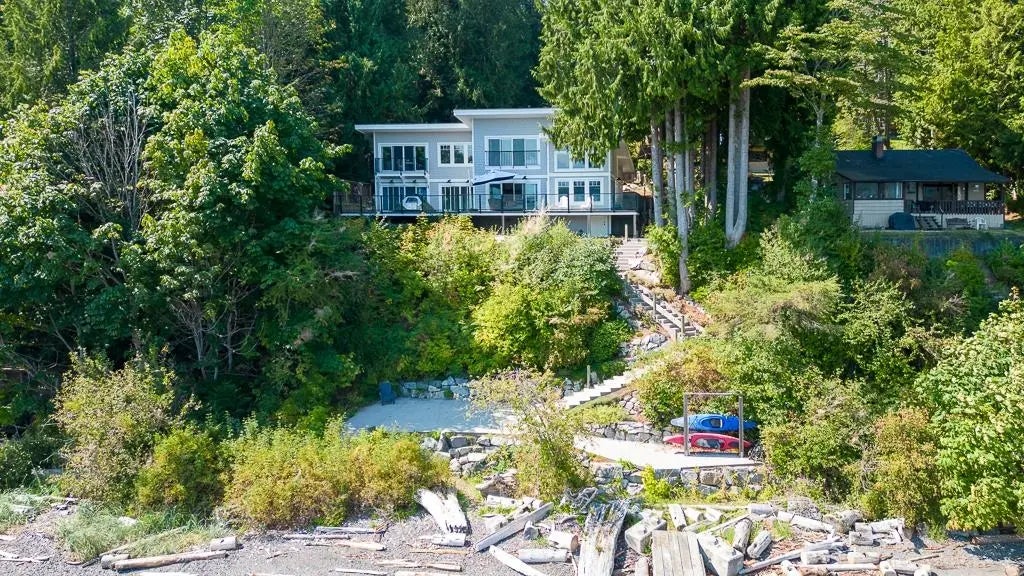 Modern westcoast contemporary waterfront with a long dock six minutes to the ferry. Water and power at shoreline. Perfect if you want a private natural setting and love to entertain. Home was custom designed with so many unique features and attention to details: including outdoor kitchen, butler kitchen, Three Primary size Bedrooms each with Ensuite, Coach house with its own double garage, huge decks - too much to note this is simply stunning and a must see if you want the best.
