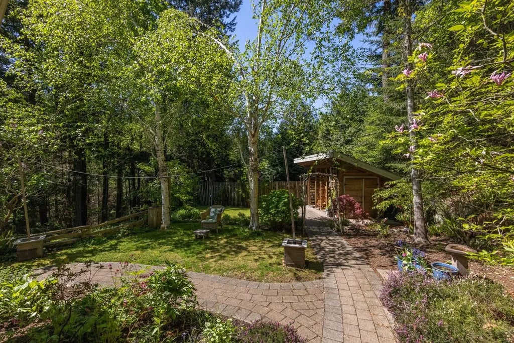 Perched on picturesque Cates Hill, this beautifully secluded 3-bedroom home offers peace, privacy, and nearly an acre of lush grounds. Surrounded by greenery, this tranquil retreat invites you to relax and unwind. Inside, the bright and airy open-concept living and dining area is filled with natural light, featuring rich hardwood floors and a cozy wood-burning fireplace that adds charm and warmth. The upper level includes a generous primary suite with ensuite bath, while two additional bedrooms, a full bathroom, and a convenient main floor powder room complete the thoughtful layout. French doors off the dining room open to a sun-soaked patio, ideal for relaxing or entertaining in the garden setting. Bonus features include a private outdoor shower & covered secondary patio.