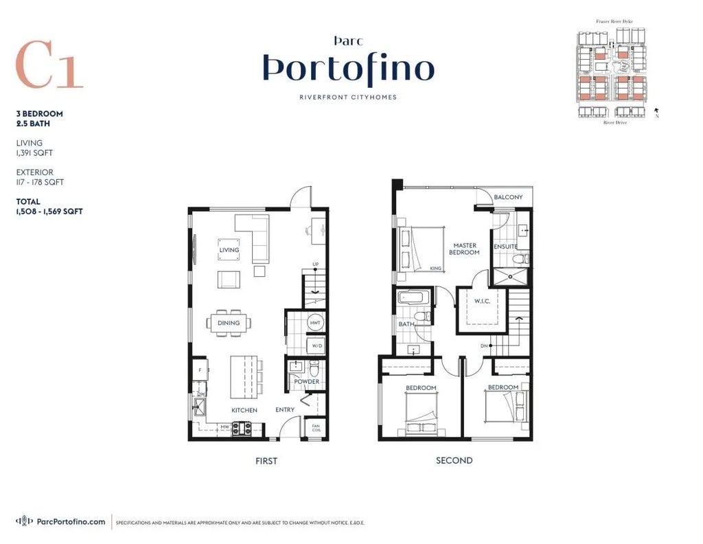Indulge in the elegance of this 1,391 SF corner unit townhome at Parc Portofino, crafted by award-winning Dava Developments. Bathed in natural light from additional windows, this bright 3-bedroom, 2.5-bath residence offers soaring 9-ft ceilings, a chef-inspired kitchen with sleek quartz countertops, a generous island, and top-tier stainless steel appliances. Step outside to your private garden patio overlooking the beautifully landscaped community gardens. Enjoy stylish glass shower enclosures, roller shades, full-size LG washer/dryer, and air conditioning for year-round comfort. Perfectly situated near the riverfront boardwalk, Tait Park, transit, and Tait Elementary. Includes a 2/5/10 new home warranty and 2 parking spots.