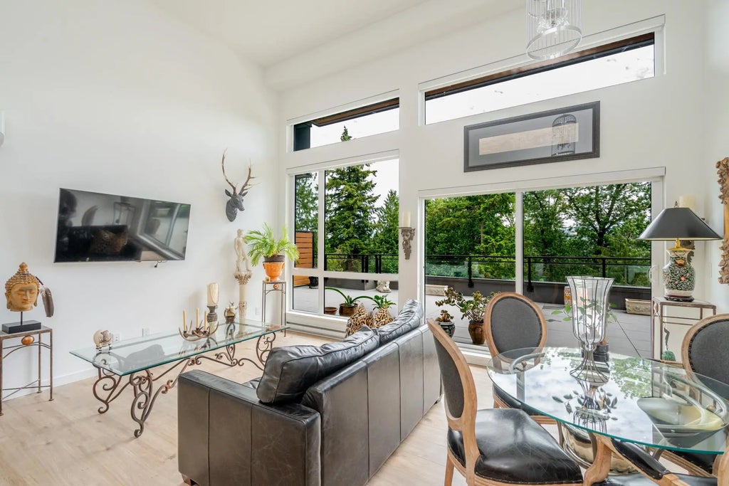 Welcome to Natura – a rare top-floor 2 bed, 2 bath penthouse in Central Abbotsford. Featuring 14' vaulted ceilings, floor-to-ceiling windows, and a 600 sq ft private terrace with sunrise forest views over Horn Creek Park. The open layout includes a gourmet kitchen with quartz counters, sleek cabinetry, and stainless steel appliances. Enjoy A/C, 2 secure underground parking stalls, EV charger, and same-floor storage. Gated complex with rooftop patio, BBQ, lounge, games room, bike room, and more. Steps to Discovery Trail and close to shopping and dining
