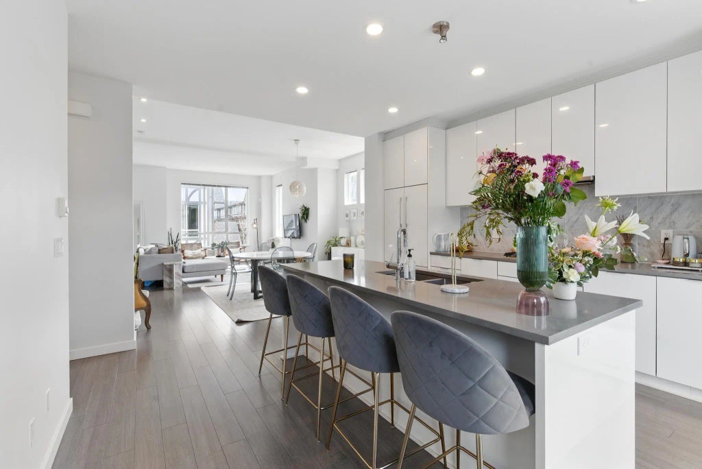 Welcome to Kingsley Estates, a prestigious townhouse complex in Richmond's most desirable Woodwards neighbourhood. This well maintained corner townhouse featuring 4 bedrooms and 5 bathrooms over 2,000 square feet living space. The main floor boasts 10-foot ceilings and an open-concept design, enhancing the home's brightness and spaciousness. The gourmet kitchen is equipped with high-end appliances, custom cabinetry and a spacious pantry. The home boasts a thoughtful layout with generously sized bedrooms, each with its own en-suite bathroom. Enjoy your private double garage and access to a 2,000 sq. ft. clubhouse. The home is conveniently located near top-rated schools, parks, and public transit and it provides an ideal blend of luxury, comfort, and convenience for modern family living.