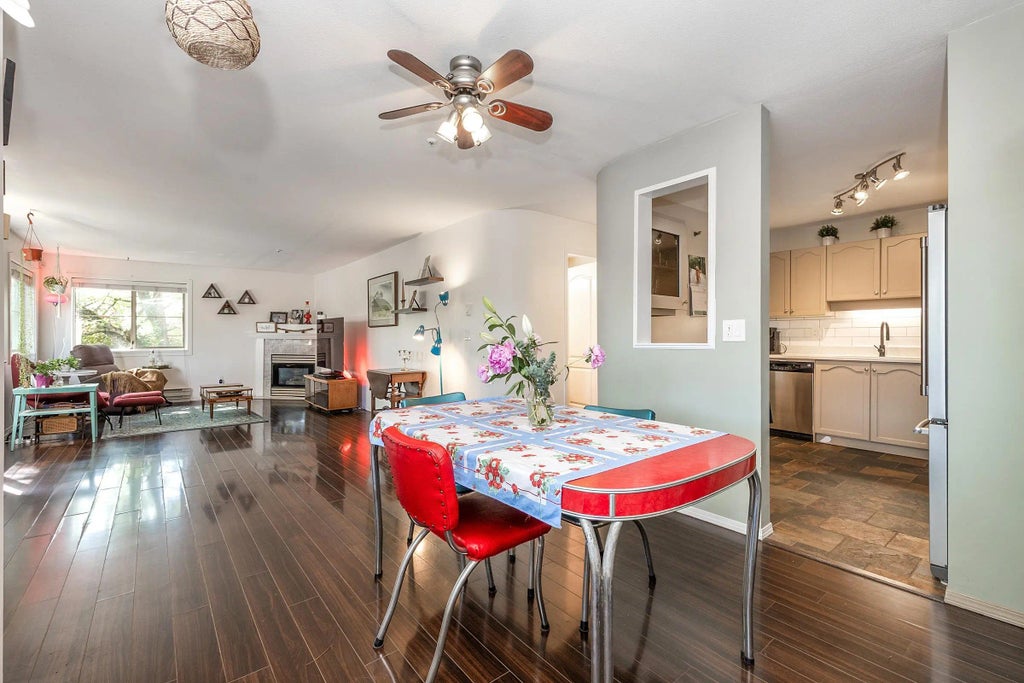 Rare Corner Gem - 2 Bed + 2 Bath. Prime Pitt Meadows location. Welcome to this exceptionally bright and beautiful corner unit offering a house-sized living room with treetop views. Enjoy natural light streaming into the expansive living and dining areas, complete with a cozy gas fireplace (gas and hot water included in strata fees). The spacious kitchen features modern appliances, stone countertops, tile backsplash, and ample cabinetry. Step into a true laundry room with storage. The king-size primary suite offers a walk-in closet, ensuite with a separate tub, plus glass-enclosed shower. Two secure parking stalls, storage locker, and very pet-friendly. Plumbing and roof replaced. There's a friendly community atmosphere and a small-town charm here.