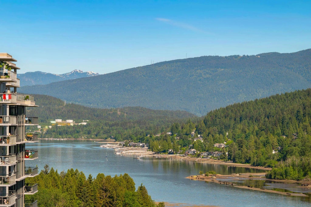 The pinnacle of luxury living with stunning WATER & MOUNTAIN views at The Residences, where nature & urban sophistication converge on the exclusive 22nd floor. Nestled in the heart of Port Moody's vibrant Suter Brook Village, this 2 bedroom & den has a layout for living, working & relaxing. Daytime fills the space w/natural light through floor-to-ceiling windows. Nighttime offers unobstructed wine-infused sunsets over the water from the balcony/indoors. High-end amenities: gym, sauna, steam room, tennis court, conference room, theater/party room, outdoor BBQ & guest suites. Prime location w/trendy shopping & steps from Rocky Point park, trails, Brewers Row, Inlet skytrain & West Coast Express. 2 parking, storage & access to 5 EV stalls. Make your dream lifestyle a reality!