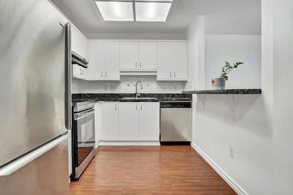 Welcome to the Penthouse at Melrose! This beautifully maintained South-East facing corner unit boasts plenty of natural sunlight. Measured in at over 950 sqft, this 2 bed & 1 bath unit provides you with a spacious flow layout. Laminate flooring throughout the unit with Stainless Steel Appliance, Granite Counter-top & Insuite side by side laundry with extra storage room. Enjoy soaking up the morning sun on your private balcony or cozy up at night with the gas fireplace. Steps away from public transportation and less than 10 mins away from both WD Ferris Elementary & Richmond Secondary School. Great entry level family home!