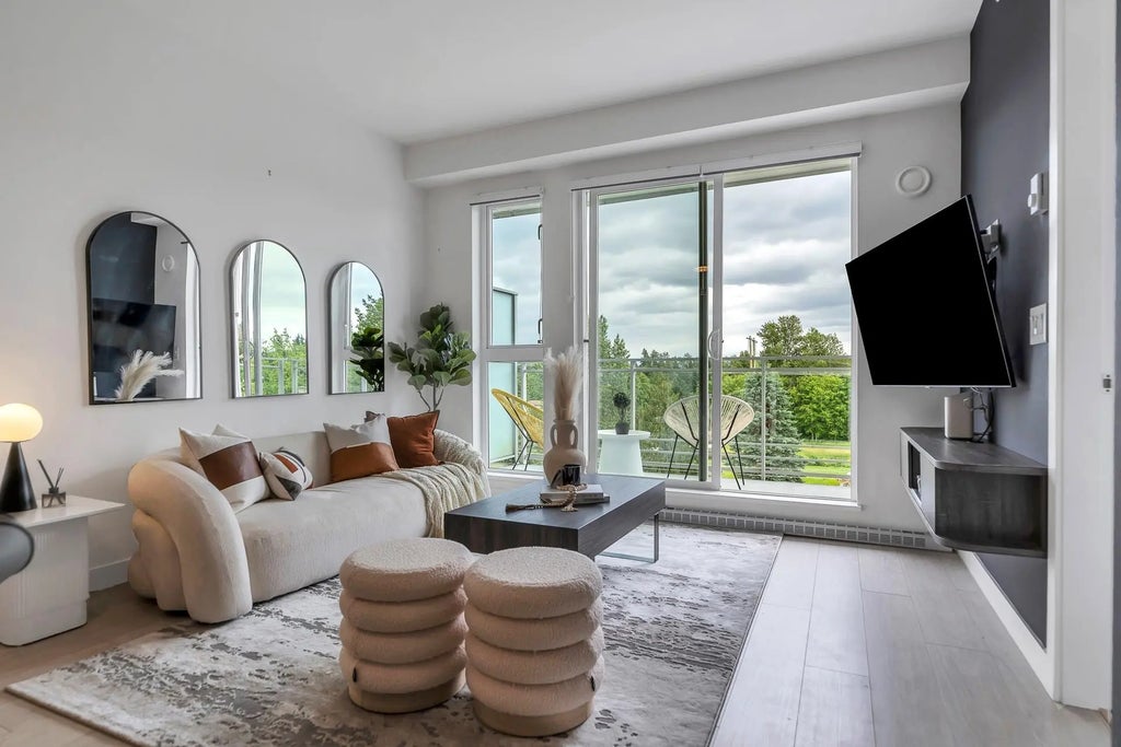 "THRIVE" at home. This spacious 1 BR and Den provides great comfort for both working and living at home. Top floor and east facing unit overlooking into the mountains. A large Den can be used as a professional home office, a home gym, or a sleeping space for the overnight guests. The primary bedroom is upgraded with laminate flooring and has a generous closet space. Lots of storage space with the well designed built-in pantry to keep all your things organized and hidden away. Enjoy the many amenities at THRIVE such as EV charge stations, full gym experience with weights, exercise machines, yoga studio, party room, outdoor ping pong table and lounge area. Convenient location and minutes to elementary school, supermarkets, parks, skytrain and shopping mall.
