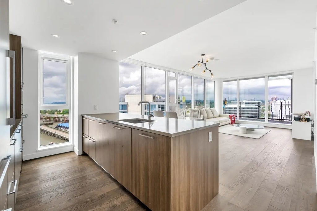 Very Good Value, BC Assessment value $1.445 M. Rare 3-bedroom penthouse at ViewStar, with only 3 units per floor ensuring exceptional privacy. This luxury 1,285 sqft home boasts soaring ceilings, A/C, smart layout, and a spacious balcony with partial water and mountain views. No upstairs neighbors guarantee quiet living. Includes 2 tandem parking stalls. Enjoy world-class amenities: indoor pool, gym, clubhouse. Unbeatable location—steps to Capstan SkyTrain, shops, dining, and scenic riverfront trails. Prestigious master-planned community by the water. Interior finishes include high-end cabinetry, Miele appliances, engineered hardwood floors, and spa-inspired bathrooms. Easy access to Vancouver, airport, and future commercial core. A rare opportunity for refined urban living.