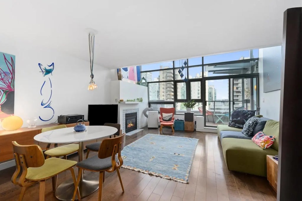 Penthouse living at Pacific Robson Palais! This 2 storey 1180 sf 2 bedroom, 2.5 bath home boasts north and south exposure. The L/R features sloping 18 ft. floor to ceiling windows with Northshore mountain view, beautiful maple pecan engineered floors, gas fireplace and generous size balcony. The open kitchen features granite countertops, s/s appliances & breakfast nook. 2 bedrooms both with ensuite bathrooms on top floor. Master bedroom is loft style open to L/R below offering city & mountain view. Bonus breezeway patio at entry. 2 side by side underground parking stalls & storage locker included. Furnished or Unfurnished. Great amenities, lap pool, jacuzzi, sauna & gym. Utilities Included. Minimum 6-month to 12-month lease