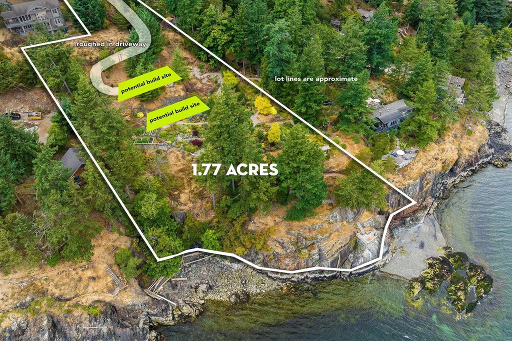 Imagine yourself here on 1.77 WATERFRONT ACRES in the Howe Sound UNESCO Biosphere, where sweeping vistas from Black Tusk to UBC & the Gulf Islands and beyond are enjoyed from anywhere you look. A path leads to a cantilevered viewing platform that is the perfect spot to view sea birds, humpback whales, orcas, seals and sea lions. This prized property, featured on several garden tours, showcase years of passion and reverence for the land. A significant portion of the property consists of walking paths that wind through a multitude of shrubs, unique trees, and perennials, all deer resistant. Easily accessed by a gently sloped driveway there is a logical, flat build site for a home, and lots of space for a second dwelling. NO FOREIGN BUYER BAN (buyer to confirm w/ professional advice).