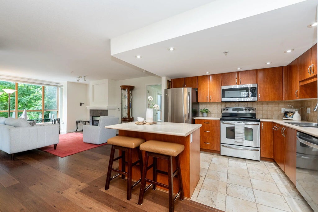 AIR CONDITIONED home at sought-after Belcarra in Newport Village! This 2 bedroom, 2 bathroom suite overlooks the quiet courtyard and offers a spacious, open plan with 1,093 sq ft of living. The kitchen features an island, stone counters, and ample storage. The living room includes a gas fireplace and opens to a covered, west-facing balcony with views of the serene courtyard. The dining area is roomy and ideal for hosting family gatherings. The primary bedroom fits a king-sized bed, and includes a walk-in closet and a 4-piece ensuite. Bedrooms are separated for privacy. Great in-unit storage, including a large pantry/flex space. Comes with 2 parking spots and a locker. All set in vibrant Newport Village - just steps to shops, the Rec Centre, SkyTrain, Brewery Row, and Rocky Point Park.