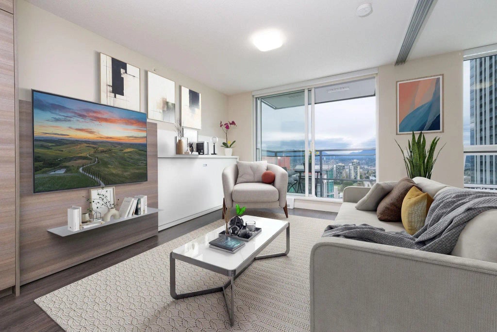 Move in now & enjoy Summer views of stunning North Shore Mountain & Fraser River from this exceptional suite! Built by BOSA, the Alumni building in the University District offers world class amenities and creative 'built-in' concept living. The kitchen island extends into a 8 person dining table, chairs included. Murphy bed, guest bed, movable TV stand, shelving... all included! Frosted panels separate the bedroom or can be hidden away for entertaining. Building hosts meeting & work spaces, gym, outdoor BBQ social area, and guest suite. Suite comes with P2 level parking & locker close together. Easy walking distance to shopping & transit. 34min train ride into downtown Vancouver! Ready to move in, no waiting!