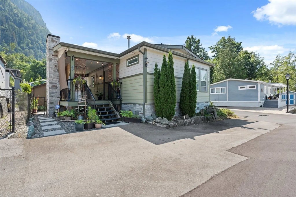 Resort-style living on freehold land! Cheerful 2-bed/2-bath home offers 864sq ft on one level with vaulted ceilings, full kitchen and in-suite laundry. Corner lot features a private fenced yard, side garden and south-facing deck with built-in gas fireplace and Bridal Veil Falls view. Heated 80 sqft studio-shed houses the laundry—perfect for hobbies or storage. Driveway parks two. Gated community adds a 12,000 sq ft log clubhouse (gym, theatre, kitchen lounge), outdoor pool, two hot tubs, pickleball/tennis, volleyball and dog run. Pets and rentals OK. Minutes to Hwy-1/Chilliwack, steps to Bridal Falls and near the proposed Cascade Skyline Gondola for future four-season appeal.