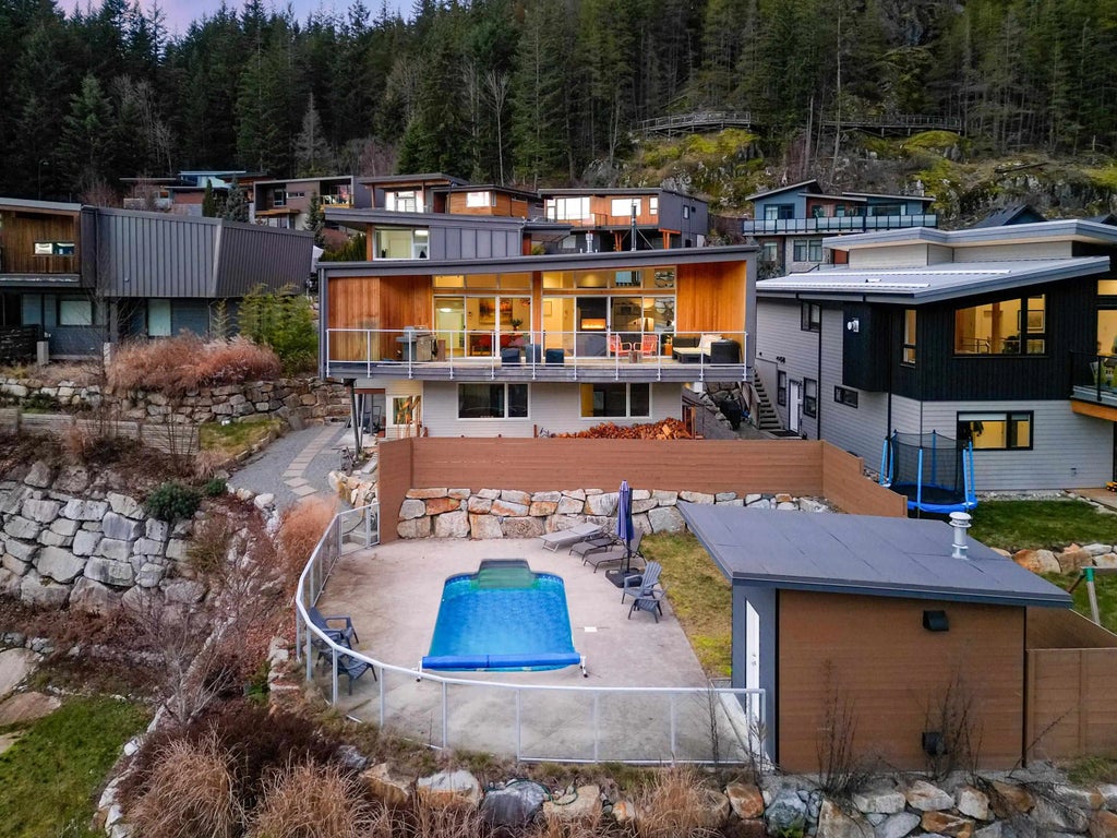 Nestled in Crumpit Woods, 38555 Sky Pilot Drive is a custom-built home blending contemporary design with functionality. Spanning 2,807 sq. ft., it offers a bright main living area flowing onto a balcony with stunning mountain and ocean views. The open kitchen is ideal for gatherings, while 4 bedrooms, a rec room, and a double garage provide ample space. The top-level primary suite boasts an en-suite and private patio. Outside, enjoy a rare front-yard swimming pool, patio, and lawn—a true family oasis.