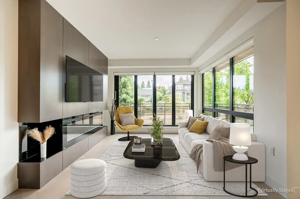 Available immediately - this elegant, like NEW 969sf, 2 bdr+flex, corner suite. A fashionable design gem both suite & building! Open concept, it features: a beautiful kitchen w/Caesarstone counters, sleek cabinetry & hi-end appliances; white oak H/W flooring throughout, stylish 72” fireplace, A/C, & is bright from large folding window walls that open for easy access to the wrap-around balcony to enjoy year round. Well-separated bedrooms; Primary with spa-inspired ensuite & in-floor heat. Amenities include: communal BBQ area, Gym, Kids Play Area, & Rooftop garden plots. Secured parking w/EV charging. Pets welcome! Ideal location - close to schools, Canada Line, Cambie Village for cafes, shops & services, Douglas Park, community centre, youth centre, daycare & more!