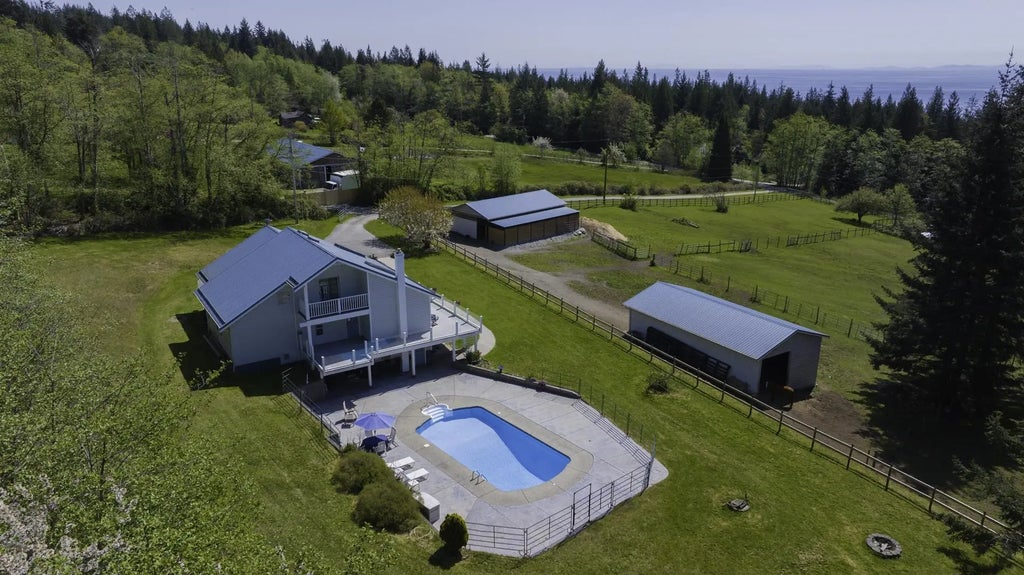Hold your horses ... you've found it!! Executive Oceanview estate on 4.3 acres with Southern exposure. 5 bedrooms and den, 4 full baths on 2.5 levels. Included in the 5 bedrooms is a 1 bedroom and den suite. Open plan living with some recent upgrades, vaulted ceilings, metal roof and wrap-around main level deck. 32'x16' salt water pool with stamped concrete and exposed aggregate deck perfectly set up for entertaining. Thoughtfully set up for horses with one 48'x34' barn with feed room and hay storage and a second open barn, 48'x24'. Plenty of green fields for grazing, every inch of the property is utilized but still easy care. 3 bedroom, 1 bath, tenanted mobile has its own separate entrance.