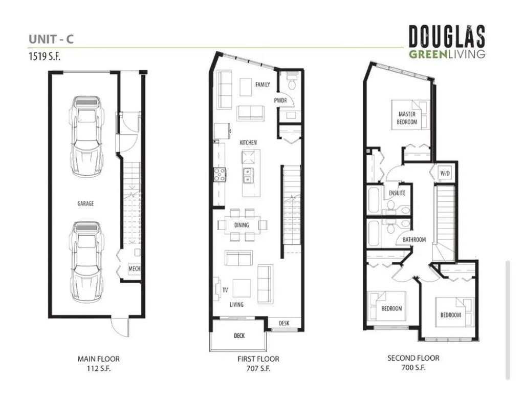 Welcome to Douglas Green Living in Pacific Douglas! Brand-new 3 level 3 bed + 3 bath townhouse (1,519 sq.ft.) with modern open-concept layout, stylish kitchen w/ quartz counters & stainless steel appliances, and laminate flooring. Upstairs has spacious primary w/ ensuite + 2 bedrooms. Tandem double garage + balcony & patio. Complex offers clubhouse & playground. Assignment of Contract – completion est. 2025. GST applicable. Measurements from developer floorplan, buyer to verify if important. Taxes not yet assessed.