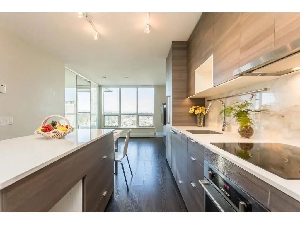 Spacious one-bedroom in the renowned Alumni Tower high-rise by BOSA. This bright east-facing home showcases unobstructed city views and innovative design. Features include a Murphy bed with mattress, a kitchen island with pullout dining table that seats up to 8, built-in appliances, a floating TV panel with guest bed, and abundant storage. Ideally located in the heart of Surrey City Centre, just steps to SkyTrain, bus loop, SFU, City Hall, library, restaurants, and T&T Supermarket.