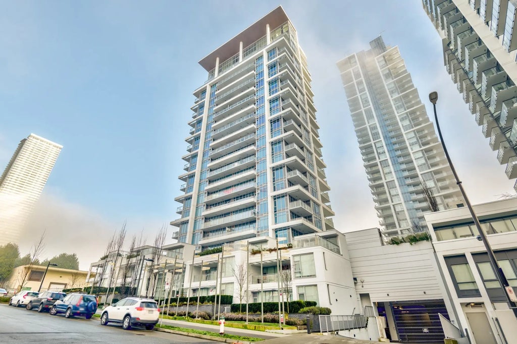 Year-round comfort and style with Air Conditioning. This bright home features 9ft ceilings, floor-to-ceiling thermo windows, and a spacious 107 sqft balcony. The smart layout includes 2 large bedrooms on opposite sides for added privacy. Enjoy a sleek kitchen with Miele appliances, gas cooktop, quartz counters, premium cabinetry, and under-cabinet LED lighting. Laminate flooring throughout adds a modern touch. Building amenities include a concierge, gym, BBQ area, playground, and green space. 2-5-10 Warranty provides peace of mind. Located in vibrant Brentwood Village, just minutes from Costco, Whole Foods, SkyTrain, and highway access. EV charging available. Pet-friendly with no size or breed restrictions. Showings by appointment— CALL your Realtor today! $50,000 below assessment!