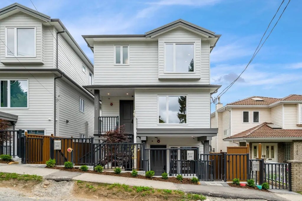 Quality built brand new two level front unit in a Triplex setting. No Strata Fee. The main floor comes with a bright and spacious living room ,dinning room and a gourmet kitchen. The second floor has 3 bedrooms and two full baths. Other features include; Air condition, HRV, Heat Pump, Fridge, Stove, Washer and Dryer, Dish Washer, Window coverings, security system, EV outlet, Fully landscaped and fenced. Built by a reputable builder with years of experience. Prime location ideally situated between the Joyce-Collingwood and 29th Ave Skytrain stations, close to park, school and bus. Easy to Show. By Appointment Only.