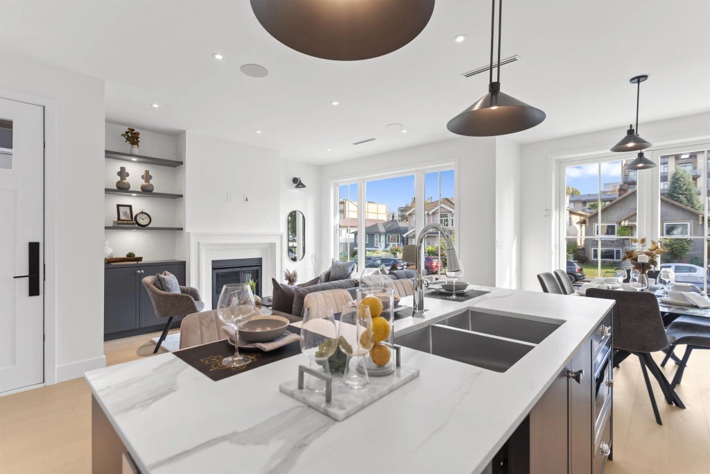 Welcome to this farmhouse-style half duplex located in the heart of Vancouver Heights, offering under 1,900 sq ft of beautifully finished living space. The open-concept main floor showcases wide plank hardwood flooring thru out the main & upper floor, stone kitchen countertops, wainscoting walls and premium built-in Fisher & Paykel appliances, plus gas washer, dryer, stove and fireplace. French doors off the main-floor open to the outdoors, built-in speakers, security cameras, HRV, gas furnace and a heat pump with A/C ensure comfort and peace of mind. Upstairs includes a spacious floor plan with a larger primary bedroom leading to a lux ensuite with a second bedroom and bathroom, Vaulted ceilings and a bright spacious one-bedroom suite. Pictures taken from 4315. 90% complete.