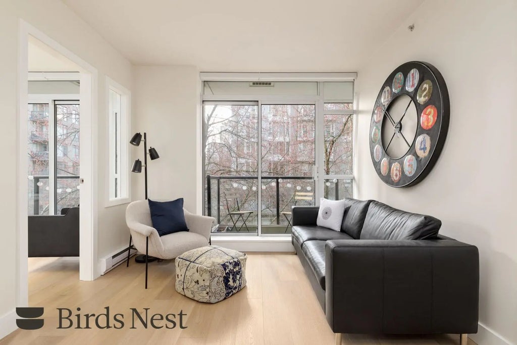 Welcome home to Tribeca Lofts, the boutique, New-York Style building nestled in the coveted Yaletown neighbourhood. This thoughtfully designed condo features engineered hardwood flooring throughout, over-height ceilings, and floor-to-ceiling windows that flood the space with natural light and fresh air. The open-concept design is complemented by contemporary furnishings, included with the home. The balcony provides the perfect spot to relax while taking in views of the city skyline. The gourmet kitchen features ample cabinetry and counter space, granite countertops, and premium Bosch appliances. For more information or to book a showing, please visit birdsnestproperties.ca