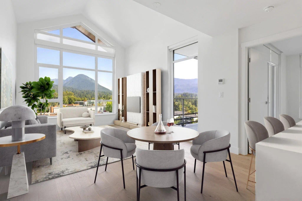 Lynn Valley Living in the Residences by BOSA! Beautiful 1000+ square foot 2-BEDROOM, 2-BATH plus DEN home with stunning VIEWS of snow-capped North Shore mountains. Modern open-concept layout features with soaring cathedral vaulted ceilings for maximum light and bringing the outdoors in. Entertaining takes centre stage with the Chefs kitchen, premium appliances and seamless indoor-outdoor living. Solid concrete building by BOSA means peace of mind. Premium amenities along with premium location just steps to Lynn Valley Centre for shopping and dining world-class hiking and biking trails outside your door. Includes oversized storage locker just down the hall and parking. Pets welcome. Call to view and see why we're excited to present this rare offering!