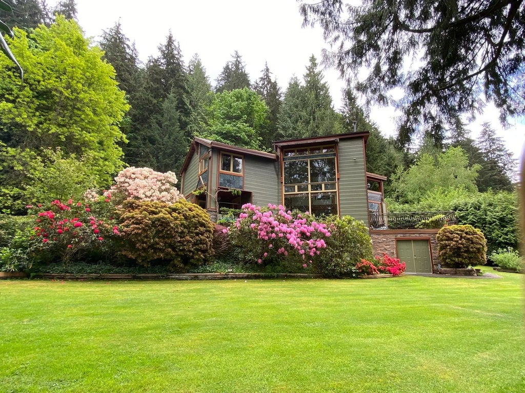 Private! Unique! Below assessment value! Hiking, swimming in the ocean and warm lake at your doorstep. With the mountains and ocean views! Very well kept! On the quiet "No through" road, gates open to estate size leveled gardens & architecture designed home, backs onto parkland. House was substantially renovated for the last 6 years with the metal roof, Hardie board siding, new railing around the decks and patios, new walnut kitchen, all bathrooms were renovated and much more. 20 ft vaulted ceilings, skylights, big wood windows, & open floor plan make bright & cheery home. Curved staircase leads to large landing, & huge MBdrm, connecting dressing room w/separate vanity, & sink! Downstairs is a large rec room & (den/bdrm/office) has separate entrance and has a potential to make a suite.