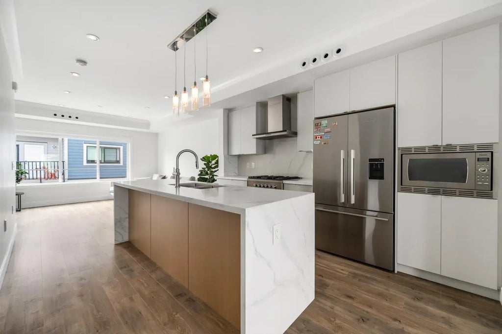 This Sterling townhome spans three levels and offers 1,351 sqft of comfortable living space, featuring 3 bedrooms and 3 bathrooms. The main floor boasts an open-concept layout with quartz countertops, creating spacious and inviting living and dining areas. The upper level includes a primary bedroom with a walk-in closet and ensuite, along with two additional bedrooms and a full bath. The home comes equipped with forced air heating, central A/C, built-in vacuum,and a security system, providing year-round comfort and convenience. Outdoor spaces include a private yard and dual balconies, plus a two-car garage with EV charging. Ideally located within walking distance to South Arm Park and Community Centre. School catchments: James Whiteside& Hugh McRoberts. Open House Oct 18-19, Sat&Sun 2-4PM
