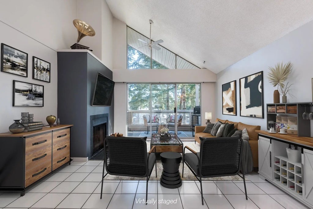 “The SHAUGHNESSY” in West Coquitlam. TOP FLOOR condo unit has 2 bedrooms & 2 baths. Be impressed with the 15+ FEET VAULTED CEILING in the living room & wood burning fireplace. The living room & dining room are perfect spot for entertaining friends. Cute kitchen /Stainless Steel fridge & stove. Good size primary bedroom with walkthrough closet to in suite laundry. The 4-piece bath & a 2-piece bath flow together. Easy care tile floors thought most of unit. In suite storage or reno to a cute little office. 2nd bedroom or den. Enjoy many hours in the summer on your balcony among the tall trees. Centrally located to transit & shopping. SkyTrain is a short stroll away. Flat walking neighbourhood. 1 underground parking spot. Move in this Fall.