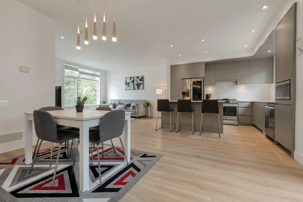 Welcome to Carson – Where Style Meets Convenience! This stunning 3 bedroom, 3 bathroom townhome blends modern design with everyday comfort. Offering 1,406 sq.ft. of open-concept living, it features a bright living + dining area and a chef-inspired kitchen with designer lighting, gas range, LG SmartThinQ appliances, and a showpiece island perfect for hosting. Step into your own private landscaped backyard oasis—a rare find for year-round relaxation. Enjoy premium touches like central A/C, forced air heating, laminate floors, and a spacious side-by-side double garage (with epoxy flooring). All in the heart of Grandview, just steps to both level of schools, parks, Grandview Aquatic Centre, shops, restaurants, and transit. Luxury, location, lifestyle—it’s all here