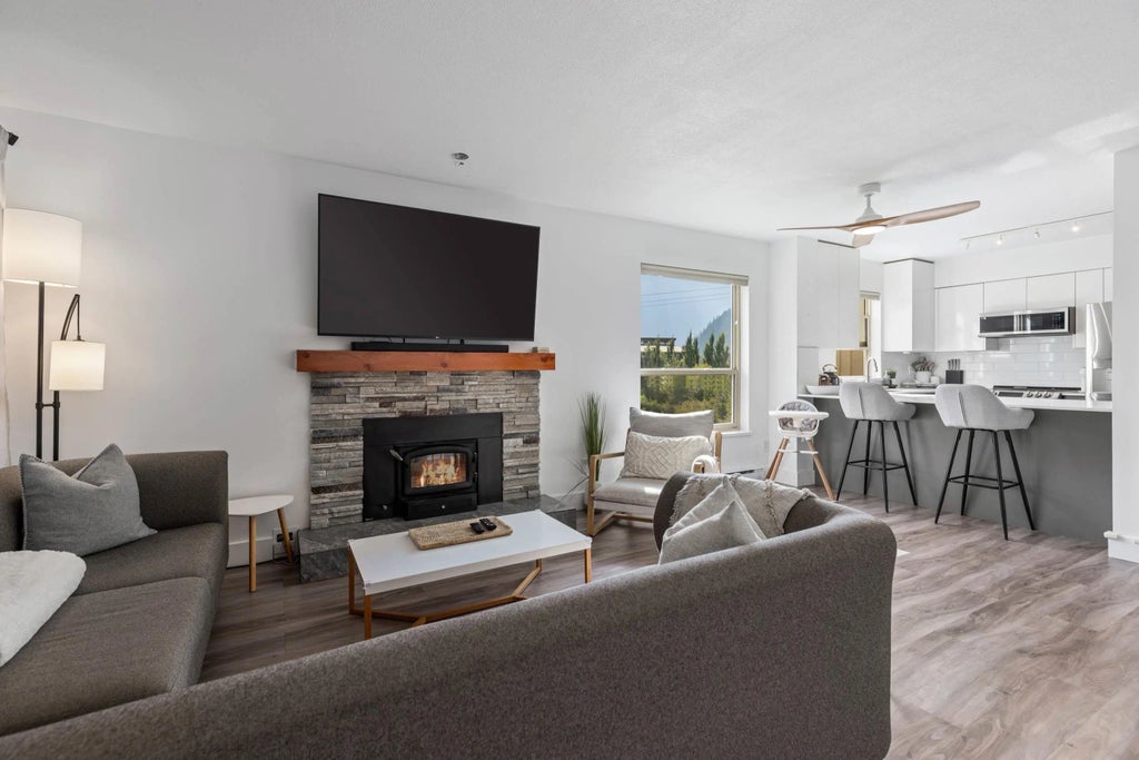 Beautifully updated corner unit with lots of natural light. Wake up to pretty sunrises, enjoy the warmth of alpenglow on the mountains in the evening, and relax on the deck with afternoon shade. This spacious condo has been extensively updated with a fully renovated kitchen featuring quartz countertops, new appliances, added cabinets and modern lighting. It has new flooring and baseboards throughout, while the bathrooms have been partially renovated, including imported Italian tile in the primary ensuite. An airtight fireplace, generous laundry and pantry provide excellent functionality. Ideally located close to shopping, the recreation center, and the bike park, this is a move-in-ready home you’ll love.