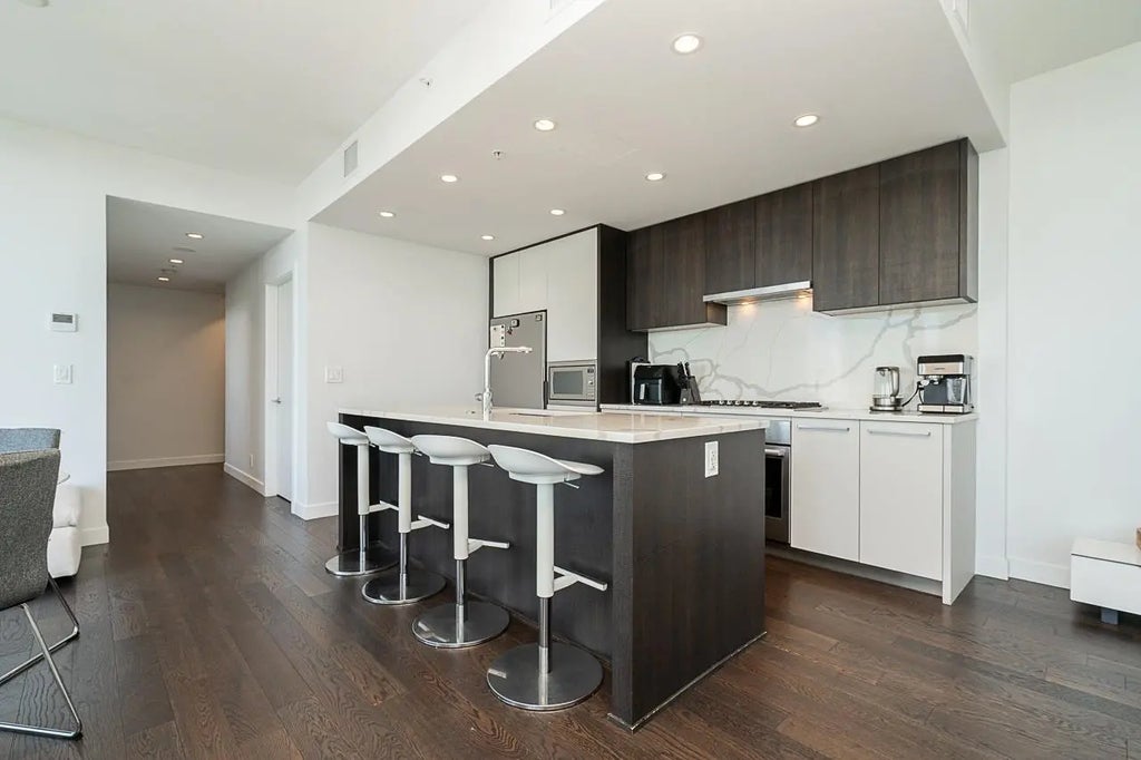 Step into bright, contemporary penthouse luxury in the iconic tower by Marcon. This stunning 2-bedroom + den, 2-bath residence soars above the city, offering breathtaking southwest views that stretch to the horizon. Inside, discover a refined interior featuring premium stainless steel appliances, quartz countertops, custom cabinetry, rich hardwood flooring, and spa-inspired bathrooms with travertine tile. Enjoy rare convenience with two side-by-side parking stalls and indulge in over 20,000 sq ft of curated amenities: a full-scale fitness centre, yoga studio, indoor basketball court, sauna, karaoke room, guest suites, rooftop lounge, and more. Located steps from shopping, dining, and the Evergreen SkyTrain Line—this is urban living at its peak.