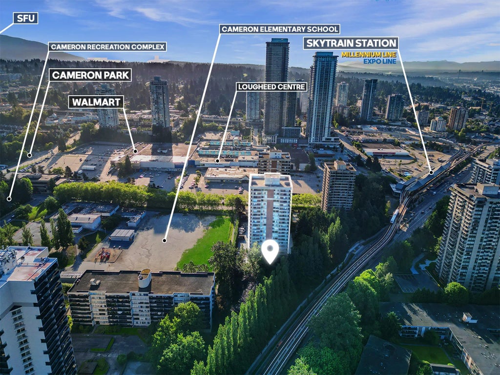 Enjoy panoramic city & mountain views from this spacious 1 bedroom corner suite at “The Maple”! Featuring updated laminate floors, modern kitchen with newer countertops, backsplash & microwave, plus a bright open living/dining area. Relax on your 200+ sqft wraparound balcony with sunset views. The large bedroom offers excellent closet space. Maintenance fee includes heat, hot water & electricity—no hydro/gas bills! Amenities: indoor pool, gym, rec room, workshop & upgraded shared laundry. 1 parking & 1 storage locker included. Steps to Lougheed Skytrain, the City of Lougheed Mall (90+ shops, restaurants & services), Cameron Rec Centre & quick access to SFU, Hwy 1 & Lougheed Hwy. Rentals & pets allowed!