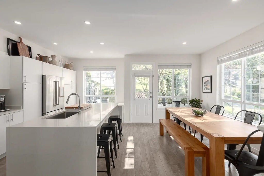 Rarely Available – a serene, park-like corner home offering fully renovated living in one of Port Moody’s most sought-after family communities. The main floor is ideal for entertaining, with morning light in the kitchen and private terrace, plus a south-facing balcony filling the living room with afternoon sun. Features include A/C, gas fireplace, custom built-ins, and extensive millwork. The dream kitchen boasts quartz counters, an oversized island, and custom cabinetry. Upstairs has 3 bedrooms and 2 baths, including a primary retreat with walk-in closet and spa-inspired ensuite. Downstairs, a large 4th bedroom with ensuite provides flexible space for guests, media, or rec room. 2-car heated garage, EV-ready. Easy access to schools, parks, trails, transit, this is the complete package!