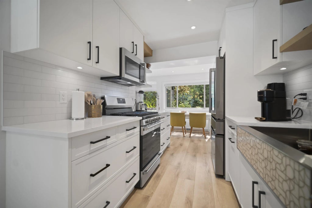 Park-front Alderwood townhome renovated and move-in ready. The main level features a bright, open kitchen with quartz counters, under-cabinet lighting and a built-in dining seating, new lighting. Upstairs offers three bedrooms, a renovated bath and a handy laundry centre. The finished lower level adds real flexibility: An office/den, a family/media room, a home gym space and a new full bathroom. Upgrades also include vinyl plank flooring throughout, hot water on demand and popcorn ceilings removed. Park facing patio with a short walk to trails, courts (tennis and basketball) and ponds. Parking for 2 and ample visitor parking. ~5-min walk to Earl Marriott Secondary; near Peace Arch Elementary, shops and transit. Pet-friendly (2) and rentals allowed. Open House: Sat, March 4, 1 to 3 pm