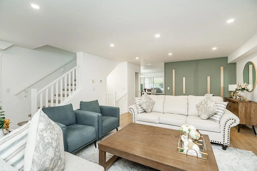 Welcome to this UPDATED End Unit w/4 CAR Parkings Incl. Side by Side Garage & expansive covered sundeck in exceptionally managed BELMONT AT SOUTHLANDS. Unit boasts expanded granite kitchen counters & a full stainless appliance package, including a microwave & built-in wine fridge! Recent upgrades include new light fixtures, pot lights, fresh paint, new flooring, an updated fireplace, epoxy flooring in the garage, and two updated bathrooms. Powder room main floor and a large open living and dining area that walks out at street level. Upstairs, you'll find 3spacious bedrooms, and the bonus room downstairs serves as a guest room. Located within walking distance to Willowbrook Mall, transit, schools, and just 1km from the future SkyTrain station.