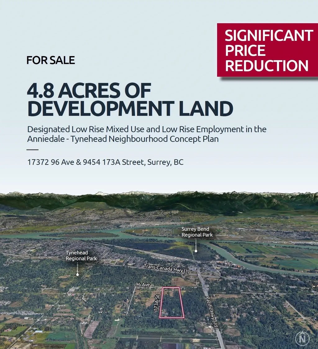 4.8 Acre Development Site available for Sale in North Surrey. Located within the Anniedale-Tynehead NCP and specifically situated within the "West Amendment Area" of the plan, which will be the first area to be developed. Surrey city council endorsed Stage 1 of the plan in September of 2024 and are now working on Stage 2. The site is designated as a mix of "Low Rise Mixed Use" and "Low Rise Employment" allowing up to 6 stories in height with a density of 2.2 FAR. Construction of a sanitary pump station is currently underway and a previously completed sanitary trunk sewer force main and feeder water main will make the West Amendment Area serviceable and ready for development in the very near future. Call for an information package.